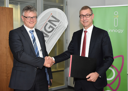 NGN-Geschäftsführer Christof Epe (links) und Dr. Michael Schmidt, Geschäftsführer innogy Metering, vereinbaren Zusammenarbeit.
