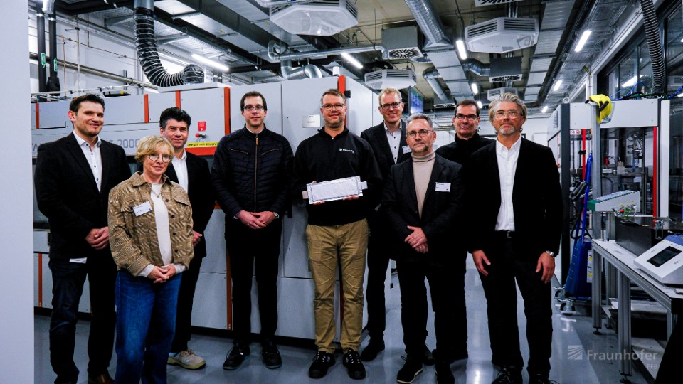 Vertreterinnen und Vertreter der fördergebenden Ministerien und zuständige Mitarbeitende der Fraunhofer FFB präsentieren die erste funktionsfähige Lithium-Ionen-Zelle, die in der FFB PreFab auf durchgängig europäischer Anlagentechnik gefertigt wurde.
