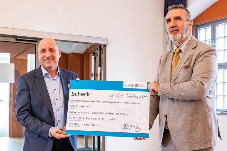 Das Thüringer Ministerium für Digitales und Infrastruktur unterstützt jetzt mit einer Förderung von zwei Millionen Euro den Neubau und die Optimierung des Wärmenetzes in der Stadt Ohrdruf. Infrastrukturminister Steffen Schütz (BSW) übergab dazu jetzt einen Zuwendungsbescheid aus dem Europäischen Fonds für regionale Entwicklung (EFRE) an Bürgermeister Stefan Schambach (SPD). Wie das Ministerium mitteilt, verfolgt das Projekt eine zukunftsfähige Wärmeversorgung der Stadt, die verstärkt auf erneuerbare Energien setzt.