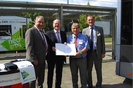 v.l.: Manfred Maas, Investitionsbank Sachsen-Anhalt; Verkehrsminister Thomas Webel; Matthias Krause, Geschäftsführer der Stadtwerke Halle; Wirtschaftsstaatssekretär Marco Tullner