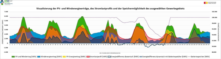 Darüber hinaus kann das Tools abschätzen, in welcher Form und in welchem Maße örtlich vorhandene erneuerbare Energiequellen zur lokalen Deckung des Energiebedarfs der Wirtschaftsfläche sowie des unmittelbaren Umfelds beitragen können. Berücksichtigt wurden unter anderem die regenerative Energieerzeugung aus Photovoltaik, Windenergie und Geothermie. Aktuell werden auch angrenzende Infrastrukturen wie beispielsweise Kläranlagen in die Analysen einbezogen, da sie häufig bislang ungenutzte energetische Potenziale bieten – etwa durch Abwärme oder die Nutzung von Faulgas zur Strom- und Wärmeerzeugung. Zudem zeigt das Tool auf, in welchem Umfang eine externe Energieversorgung durch die Anbindung an die öffentliche Energieinfrastruktur benötigt wird. Das Tool berücksichtigt zudem Großbatteriespeicher und Stromspeicher, um stärker die Aspekte der dezentralen Versorgungssicherheit und Flexibilität zu erfassen. Die Speicher werden auch grafisch dargestellt, wodurch die Auswirkungen auf Lastverläufe und Energieflüsse unmittelbar sichtbar werden. Dabei lässt sich die Batteriegröße individuell anpassen, um verschiedene Szenarien zu vergleichen und den Nutzen unterschiedlicher Speicherlösungen zu bewerten.