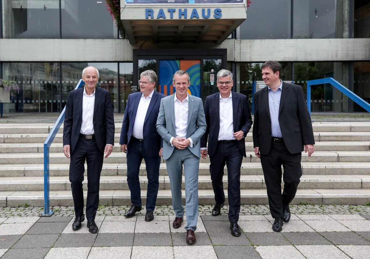 v.l.: Günther Weiß, EVO-Technikvorstand; Peter Walther, SOH-Geschäftsführer; Dr. Felix Schwenke, Oberbürgermeister Offenbach; Dr. Gabriël Clemens, MVV-Vorstandsvorsitzender; Dr. Christoph Meier, EVO-Vorstandsvorsitzender